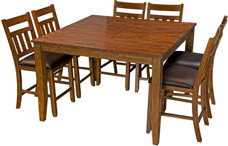 A-America® Mason Gathering Table with butterfly leaf and square top shape and 4 A-America® Mason Barstools with slatback design and upholstered seating.Read More