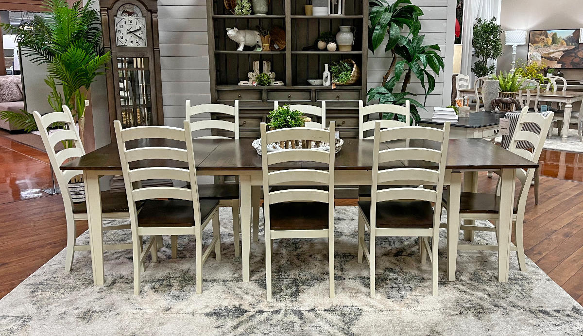 Lightly distressed, bright, two tone collection with a country flavor. The unique function and innovation of this according Vers-A-Table transforms a comfortable area of 2-4 up to a party of twelve!