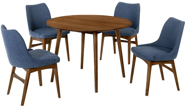 Hints of Scandinavian design and a mid-century modern feel come together to create the perfect space to share a meal with friends and family. Round tables are great because they can accommodate the most people. It’s easy to squeeze in an extra table setting or two where there aren’t any corners! The Azalea dining chairs feature soft fabric upholstery luxuriously wrapped around the entire seat - covering the ultra-comfortable foam padded cushion. Featuring a wide back and spacious seat, you never have to feel confined to a small space. The clean, sleek, and geometric wooden legs add a modern style to this chair - also assuring dependability that this chair will last and give you years of enjoyment. The Arcadia and Azalea 42" round 5-piece dining set is available in your choice of a black wood finish with grey upholstered chairs or a walnut wood finish with blue, charcoal or orange upholstered chairs.