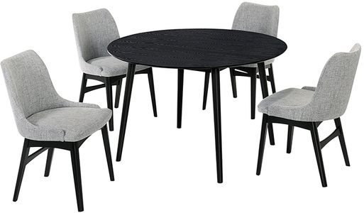 Hints of Scandinavian design and a mid-century modern feel come together to create the perfect space to share a meal with friends and family. With the 48” diameter table, you can easily pull up a few extra chairs and easily accommodate more guests. Round tables are great because they can accommodate the most people. The Azalea dining chairs feature soft fabric upholstery luxuriously wrapped around the entire seat - covering the ultra-comfortable foam padded cushion. Featuring a wide back and spacious seat, you never have to feel confined to a small space. The clean, sleek, and geometric wooden legs add a modern style to this chair - also assuring dependability that this chair will last and give you years of enjoyment. The Arcadia and Azalea 48" round 5-piece dining set is available in your choice of a black wood finish with grey upholstered chairs or a walnut wood finish with blue, charcoal or orange upholstered chairs.