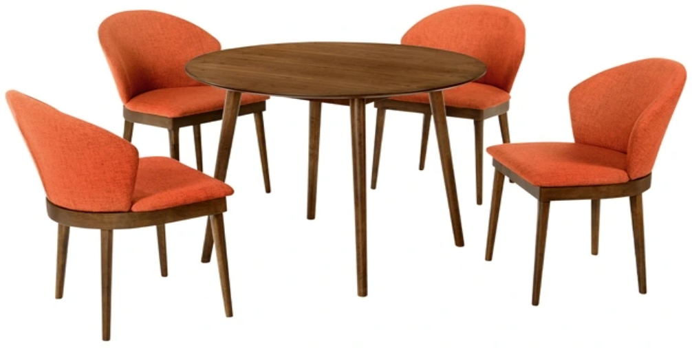 Hints of scandinavian design and a mid-century modern feel come together to create the perfect space to share a meal with friends and family. Round tables are great because they can accommodate the most people. It's easy to squeeze in an extra table setting or two where there aren't any corners! The tall, rounded seat back of the Juno chair features ergonomic properties to keep your back healthy and properly aligned. The soft fabric upholstery is wrapped around an incredibly comfortable foam padded seat cushion for your pleasure. The arcadia and Juno 42" round 5 piece dining set is available in your choice of a black wood finished table with charcoal upholstered chairs, or a walnut wood finished table with charcoal, orange, or blue upholstered chairs.