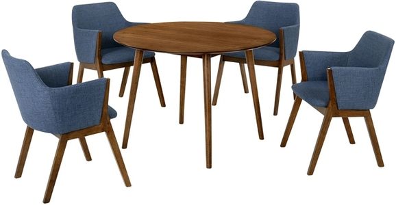 The Arcadia and Renzo 42" Round Blue and Walnut Wood 5 Piece Dining Set is the fashion forward addition that is perfect for any eat in kitchen or dining room. This 5-piece dining set will open your dining room with its clean, round table and modern chairs.Read More