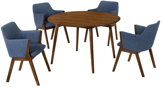 The Arcadia and Renzo 48" Round Blue and Walnut Wood 5 Piece Dining Set is the fashion forward addition that is perfect for any eat in kitchen or dining room. This 5-piece dining set will open your dining room with its clean, round table and modern chairs.Read More