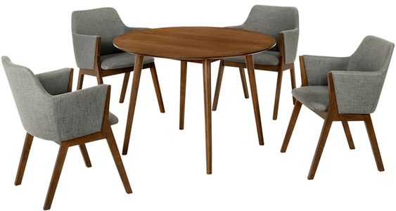 Meticulous craftsmanship and expert design have gone into the creation of this dining set, which is as functional as it is stylish. Hints of Scandinavian design and a mid-century modern feel come together to create the perfect space to share a meal with friends and family. Round tables are great because they can accommodate the most people. It’s easy to squeeze in an extra table setting or two where there aren’t any corners! These amazing Renzo chairs feature a bold and strong wooden frame that adds striking, rich qualities to these chairs - also ensuring longevity to give you years of enjoyment. The Arcadia and Renzo 42” Round 5 Piece Dining Set is available in your choice of a black wood finish with grey upholstered chairs, or a walnut wood finish with blue, charcoal, or orange upholstery.