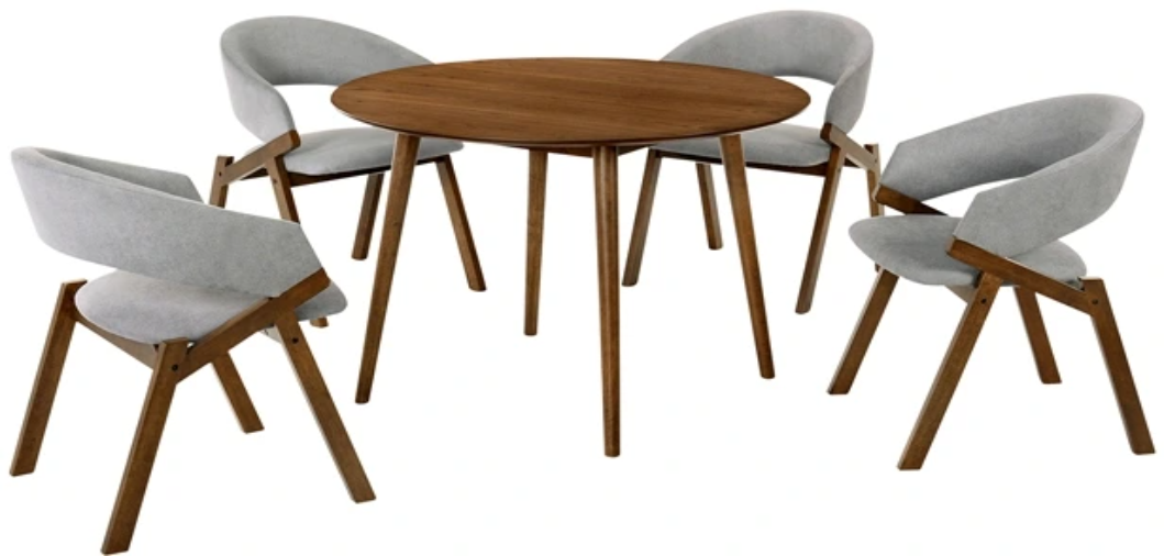 Hints of scandinavian design and a mid-century modern feel come together to create the perfect space to share a meal with friends and family. The open-back design of the talulah dining chair offers breathable seating, combined with the soft foam padded cushion - this chair will make you want to stay seated all day long. The rich fabric is alluring and authentic, looking great and performing well is what we want to offer to our customers every time. The arcadia and talulah round 5 piece dining set is available in your choice of a black or walnut wood finish with grey upholstered talulah chairs and are available as a 42" or 48" set.