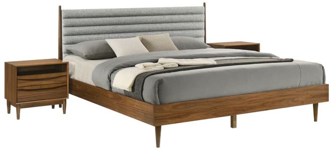 The upholstered headboard features a neat and elegant channel tufting detail to bring style and character to your bedroom or guest room. It includes slim track arms and is perched upon slender legs to make any room feel open and airy. Our versatile platform bedframe can be used with most types of mattresses, including innerspring, memory foam, hybrid, and latex. Our nightstands feature a refined and functional design that beautifully highlights the rich textures of wood. Their minimalistic silhouette is complemented with linear undercut drawer pulls to serve as a stunning design detail. Featuring two roomy drawers and a shelf, the nightstands are perfect for keeping your essentials organized and within easy reach. Bringing effortless charm and character to your home, this bedroom set seamlessly blend and complements any style or decor.