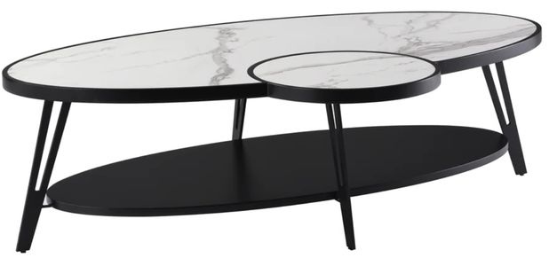 Framed by a sleek black flared-leg base, the Banks table is the perfect blend of modern style and everyday functionality. The highlight of this piece is its sintered stone top beautifully veined and smoothly honed to mimic the elegance of natural stone, while offering superior performance. Unlike traditional materials, sintered stone is highly resistant to scratches, heat, and moisture, making it ideal for homes that embrace both style and activity. Whether serving cocktails, books, or everyday essentials, this surface is designed to hold up and stand out. Beneath the surface, the frame combines a powder-coated black metal base with subtly flared legs that add both visual balance and structural stability. The contrast between the crisp white top and dark, angled base gives the table a bold presence while the low, elongated oval shape adds softness and flow to open-plan spaces or living room arrangements. Built with a sturdy wood core, reinforced by metal and protected by rubber floor pads, the Banks table is made for daily living. Its thoughtful materials, seamless silhouette, and easy assembly (tools included) make it a go-to piece for modern homes, high-style lounges, and curated hospitality settings alike. For those who appreciate clean lines, natural textures, and a contemporary statement the Banks coffee table delivers a flawless first impression.