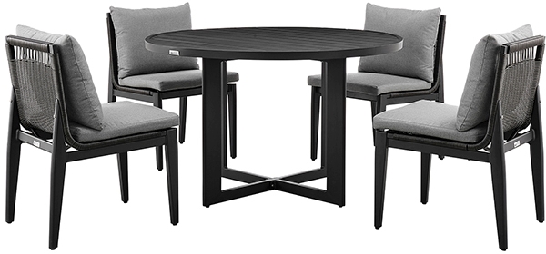 Dine outdoors and soak up the scenery with the Cayman Outdoor 5-Piece dining set from Armen Living. The Cayman dining set includes 4 outdoor chairs with cushions and 1 round patio table. Rattan is intricately woven around the back of the seat to serve as a unique and elegant detail and featuring ergonomic properties to keep your back properly aligned.Read More