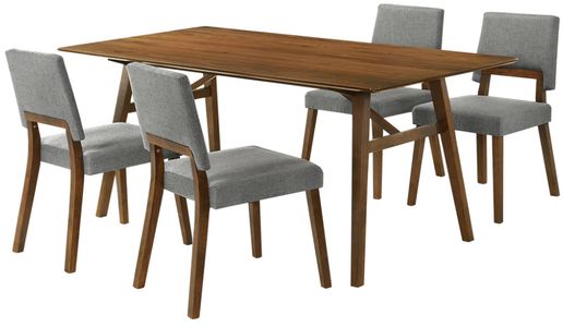 Its slim and elongated profile makes it a practical and elegant choice for your kitchen, dining area, or living space. It provides ample leg room to serve as a comfortable option for enjoying meals, entertaining, or spending leisurely time. The neatly tailored dining chairs feature an upholstered back and seat to deliver a comfortable stay, it's back opening offers breathability. The wooden frame and gracefully angled legs add to the elegance of our chairs. They feature a subtly reclined back to pack comfort and functionality within their sleek armless design. This dining set is constructed with a combo of engineered and rubberwood and features durable polyester upholstery. This set includes 1 dining table and 4 dining chairs. The Channell Wood Dining Set is available in your choice of a walnut finish with charcoal, blue, and orange fabric upholstered chairs or a black finish with charcoal fabric upholstered chairs.
