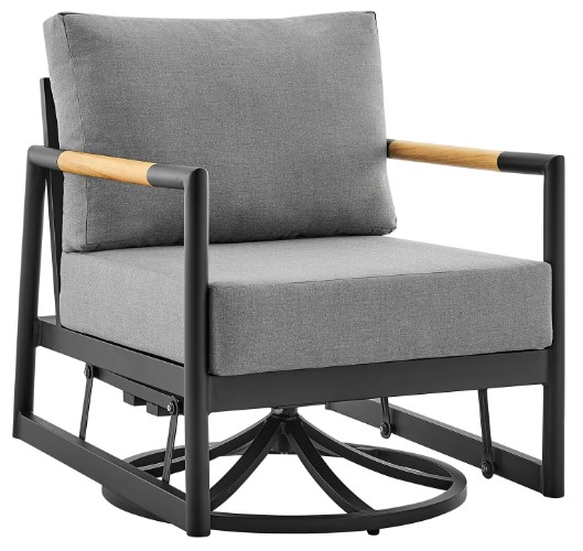 The Crown outdoor patio swivel glider lounge chair in black aluminum and teak wood with cushions combines comfort and convenience. This outdoor gliding chair features durable and lightweight aluminum frame complete with warm teak accents on the arms.Read More