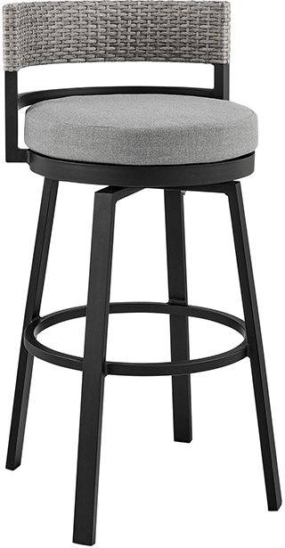 Showcasing a round and streamlined silhouette with slanted legs, this outdoor bar stool serves as an elegant and charming addition to your backyard, patio, pool area or screened in porch. It includes a 360-degree swivel function to add to the entertainment factor and maximize mobility, making it the ideal piece of outdoor patio furniture for your home. The light grey cushions for this metal barstool not only feature high density foam that will allow for many hours of comfortable seating; the cushions also feature a zipper closure that allows for easy removal and cleaning! Made up of lightweight and durable aluminum framework, the Encinitas outdoor bar stool is a staple piece of outdoor furniture and is easily portable and features a multi-layer powder coating for further effective protection from the elements and everyday wear and tear. This is a perfect piece to use indoors and is treated to withstand being outdoors. The Encinitas outdoor bar stools are available in 26 or 30-inch seat heights and feature dark grey cushions, a black finish on the aluminum frame, and grey wicker. The Encinitas can support up to 308lbs per stool.