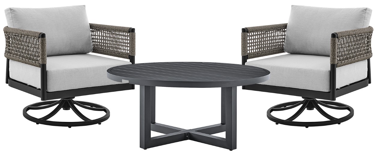 The Felicia and Argiope 3-Piece Patio Outdoor Swivel Seating Set in Black Aluminum with Grey Rope and Cushions is a perfect addition to your backyard, patio, pool area, or screened-in porch. The modern and clean line silhouette of the outdoor swivel rocking chairs is complemented by unique woven rope arms. The rope is treated to be protected from water, UV, oil, and fading.Read More