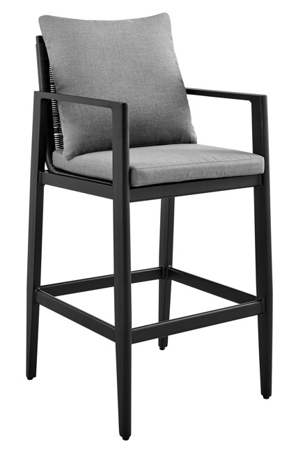 This unique piece of metal and wicker patio furniture includes plush dark grey high-density foam cushions to offer a wonderfully comfortable sitting experience. Featuring a minimal and sleek design, this outdoor patio bar stool brings effortless style to your backyard, patio, pool area, garden, or screened-in porch. The cushions also feature a zipper closure that allows for easy removal and cleaning making this the ideal piece of outdoor patio furniture! Featuring an inviting and versatile design, this outdoor bar stool with a back sits easily in any outdoor setting. Rattan is intricately woven around the back of the seat to serve as a unique and elegant detail and features ergonomic properties to keep your back properly aligned. This is a perfect piece to use indoors and is treated to withstand being outdoors. The Grand outdoor bar stools are available in your choice of 26 or 30-inch seat heights and feature a black powder coat finish and dark grey cushions. The Grand can support up to 308 lbs. per stool.