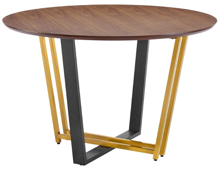 Its round tabletop features a classic walnut veneer to showcase the rich finish and natural textures of the wood. It is perched upon a clean-lined, angular base to offer a sleek and modern design. Showcasing contrasting metal finishes, the Joana dining table offers a refined touch of luxury, and it serves as a chic and versatile addition anywhere from your eat-in kitchens to dining and living spaces. The round shape creates the perfect space for enjoying dinners and socializing. With a diameter of 48", our round dining table can comfortably seat up to 4 people. Our table is crafted from durable and easy-to-clean materials to offer a reliable and low maintenance surface for enjoying dinners, conversations, and more. Available with a Walnut tabletop and Black Iron base, with either Brushed Stainless Steel or Gold Stainless Steel as an accent finish, the Joana Round Dining Table anchors your space with a dose of class and timeless elegance.