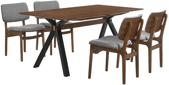 The Armen Living Laredo and Lima mid-century dining set promises an unmatched degree of comfort and dependability, making it an ideal choice for the contemporary dining room. The Laredo's modern design boasts a black frame, brilliantly complemented by the table's stylish Walnut Veneer top design. This combination finds its ideal match in the Lima’s sleek Walnut frame. Foam padded and exceptionally comfortable, the Lima offers a supportive frame wrapped in a sophisticated grey fabric package. The Laredo/Lima combination is designed to fit in any dining room but features a versatile appearance that makes it perfect for just about any room of the house. The Laredo/Lima set comes with 1 dining table and 4 dining chairs.