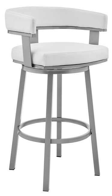 The metal frame of the Lorin is built with durability and sturdiness in mind, giving you years of enjoyment. The incorporated round footrest is an extra feature added to give you maximum comfort. The legs are tipped with rubber caps to prevent scratching or sliding on floors and help keep you home in pristine condition. The versatile look of the Lorin allows it to blend into any room in your home. The Lorin is available in your choice black faux leather with black finish, chocolate brown with java brown finish, gray faux leather with black finish, or white faux leather with silver finish. All options are available in counter and bar height size options.