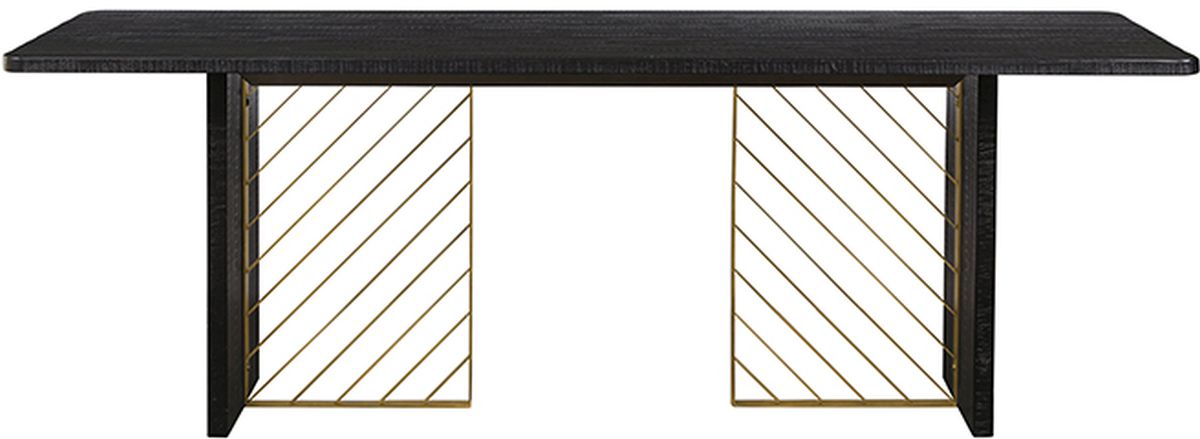 Transform your dining room with an eye-catching modern dining table that will sure impress any guests in your home. The Armen Living Monaco Dining Table features dark acacia wood top that showcase a rich and shiny look offering a silky-smooth finish touch. The antique gold metal diagonal accents lines help support the base of the table while adding a contemporary touch to any home. Casual enough for everyday use while elegant and inviting for formal occasions, gatherings and holidays. This beautiful dining table seat up to 6 guests.