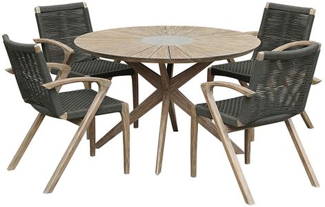 The Armen Living Oasis and Brielle 5 Piece Light Eucalyptus and Stone Outdoor Patio Dining Set is ideal for any outdoor space. Each individual table surface slat expands geometrically outward, while a super stone concrete center tastefully juxtaposes the rest of the table. Built from solid eucalyptus, the Oasis naturally repels moisture to keep the elements from affecting its resilient design. Below, crossed legs maximize leg space while maintaining a solid foundation for the table above. The Oasis table comes with 4 Brielle chairs, wrapped in resilient regatta rope cording, the seat and back provide a remarkable level of comfort while still allowing the elements to pass through. The beauty of this pairing lies in the subtle interplay of soft and neutral colors with a contemporary design structure. The Oasis and Brielle dining set is available in your choice of dark or light Eucalyptus.