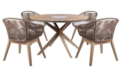 The Oasis contemporary outdoor dining table is a masterpiece ideal for the contemporary household patio. The Tutti Frutti Dark Eucalyptus and Gray Rope Indoor Outdoor Dining Chair from Armen Living is the quintessential choice of an outdoor dining chair that will give your living area a whole new aesthetic and presentation for you to enjoy. Featuring a eucalyptus wood base, the Tutti Frutti is durable and highly weather-resistant giving you years of extra enjoyment thanks to the longevity of these chairs. The incredibly comfortable seat cushion is meant to keep relaxed and alleviate any discomfort. This chair is designed with a unique feature where the frame is wrapped with highly durable and an immensely intricate woven rope - adding a completely new dimension to your outdoor furniture which will last just as long and will be even more eye-catching than conventional outdoor frame material. Pair it with wood surfaces for an eclectic boho feel or with concrete surfaces for a modern retreat. Its sturdy eucalyptus base is paired with an intricate marine-grade Regatta cord seat and topped with a soft cushion for a lesson in style and comfort. Whether enjoying a quiet evening or hosting a lively get-together, this ensemble promises enduring elegance and functionality.