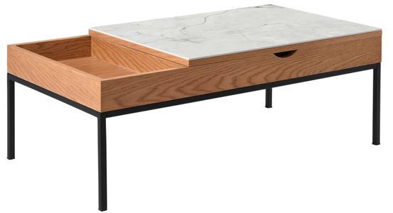 Whether you're working from the couch, hosting guests, or organizing your living space, Reba rises to the occasion literally. The standout feature is the lift-top functionality, offering a smooth, elevated surface ideal for casual dining, laptop use, or extra storage access. Beneath the clean-lined top is a hidden compartment that's perfect for stowing away remotes, books, or chargers keeping your living room organized and clutter-free. The sintered stone panel adds a refined contrast, giving the piece a designer touch with stone-like texture and unmatched resilience. This panel is resistant to heat, stains, and scratches, making it a worry-free surface for everyday use. The frame combines a natural-finish wood body with sturdy black powder-coated metal legs, giving Reba its signature balanced look warm and organic on top, sleek and structured on the base. The straightforward geometry and neutral tones allow this coffee table to blend seamlessly into modern, transitional, or Scandinavian interiors. Built for long-term use, Reba is reinforced with quality hardware and includes rubber pads beneath the legs to protect flooring. The lift-top mechanism is smooth and reliable, supported by strong metal hinges. All tools and instructions are included for an easy, hassle-free assembly. With its thoughtful mix of form and function, the Reba Coffee Table is an everyday upgrade for those who value beautiful materials and smart design in one seamless package.