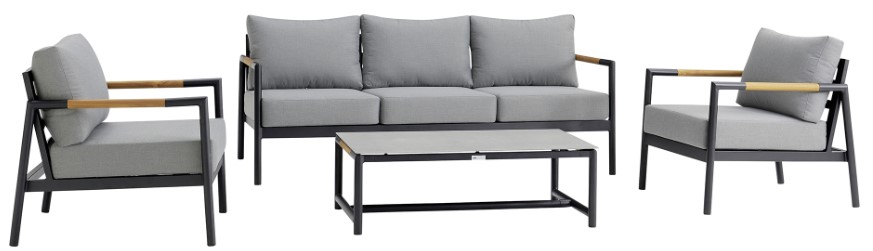 The Royal 4 Piece Aluminum and Teak Outdoor Seating Set with Cushions are available in your choice of a black aluminum finish with dark gray cushions or a white aluminum finish with light gray cushions. Complete with a sofa, 2 club chairs, and a coffee table, this set is ideal for seating up to 5. UV and water-resistant upholstery allow the Royal set to last for many years to come and the convenient zipper closure on the cushions makes clean-up a breeze!