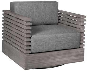 The chair's frame, constructed from durable Eucalyptus wood, adds a touch of sophistication to your outdoor space. The timeless beauty of Eucalyptus wood ensures not only visual appeal but also long-lasting resilience, making the Vivid Swivel Outdoor Patio Chair a standout piece of outdoor furniture. Designed for those who appreciate both aesthetics and durability, this chair boasts water-resistant and UV-resistant features, allowing it to withstand the elements with grace. Whether positioned under the sun or facing unexpected rain, the Vivid Swivel Outdoor Patio Chair remains a steadfast companion for your outdoor moments. Immerse yourself in relaxation with the plush Olefin cushions that adorn this swivel chair. The gray cushions not only provide a comfortable seat but also add a touch of elegance to the overall design. With water-resistant capabilities and easily removable covers, maintaining the freshness and allure of your outdoor oasis has never been easier. Versatile and inviting, the Vivid Swivel Outdoor Patio Chair effortlessly enhances any outdoor environment, from a tranquil garden retreat to a lively patio setting. The swivel feature adds a dynamic element, allowing you to effortlessly turn and take in your surroundings, making it a perfect choice for those seeking both comfort and engagement in their outdoor space. Invest in outdoor furniture that blends style and functionality seamlessly, and choose the Vivid Swivel Outdoor Patio Chair in Eucalyptus Wood with Olefin Cushions.