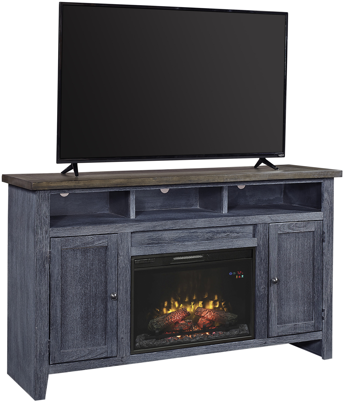 Electric Fireplace: Heater provides supplemental zone heating for small and large rooms. Tempered glass front display includes a traditional log set and ember bed. Eco-friendly, energy efficient fireplace does not emit any emissions or other hazardous byproducts. Remote control (batteries included) to provide added convenience. Flame effect can be operated with or without heat, providing the ambiance of a gentle rolling fire all year long. 4,600 BTU heater provides supplemental zone heating for up to 400 square feet.