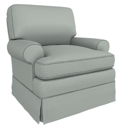 Traditionally styled this swivel glider chair features a heavily cushioned pillow back and reversible, banded seat cushion. The large, rolled arms are accented with cording, dressing up this beautiful chair. The look is finished off with a slightly taller skirt.Read More