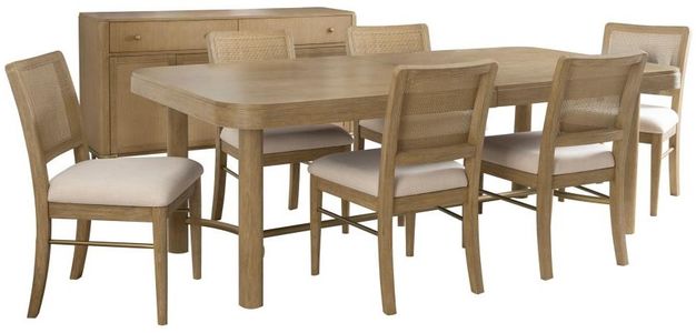 Dining set in sand wash finish includes a trestle table and handwoven cane-back chairs for style