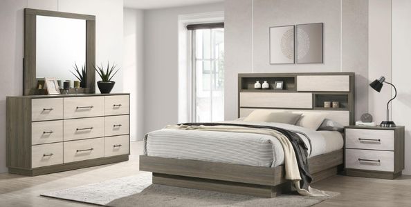 Transform your bedroom with this contemporary set, available in multiple configurations. Each set includes bed with a bookcase headboard featuring a hidden storage compartment, offering both charm and practicality. The sleek two-tone melamine design blends natural wood tones, complementing any decor ensuring easy access and a touch of vintage charm.Read More