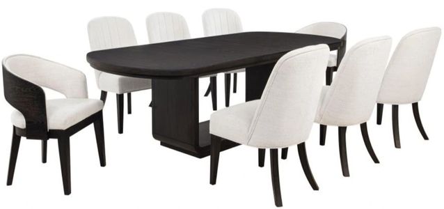 Designed for connection and crafted with grace, this dining set brings architectural beauty to everyday meals and special gatherings alike. A rectangular extension table, finished in burnished black, expands with a removable leaf and smooth cable glides to accommodate more seats with ease.Read More