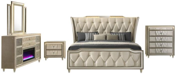 This bedroom set transforms everyday rest into a radiant retreat, blending plush textures with ambient light. Upholstered in ivory and camel velvet, each piece is trimmed in LED lighting for a soft glow. The dresser features a built-in flame visualizer with a clear tempered glass top and wireless remote.Read More