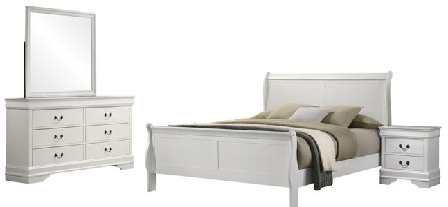 A transitional four-piece bedroom set impressed with a crisp white finish and subtle decoration