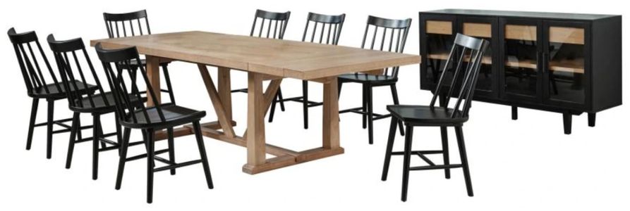 Includes: One (1) dining table, eight (8) side chairs, and one (1) sideboard