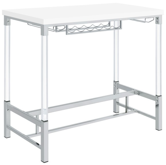 A chic bar table offers ample storage and stylish appeal with acrylic legs