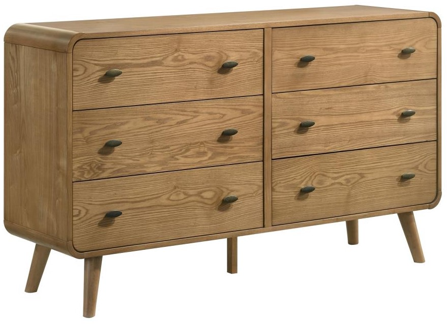 Keep your space neat and organized with this sleek mid-century modern dresser, built with rubberwood, engineered wood, and ash veneer for durability. Featuring six spacious drawers, it offers ample storage for clothing and accessories. Rounded edges and tapered legs exude retro charm, while the felt-lined top drawers add functionality for storing delicate items.Read More