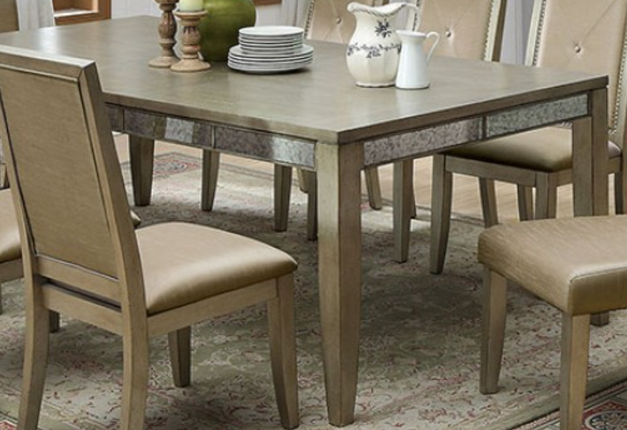 Dine in style with this fabulous Antique Gold finished dining set. Antique mirrors accent the set, adding soft reflections that glimmer in natural light. Cushioned chairs are elegantly detailed with nailhead trim and single tufted accents. Dazzle with the geometrically designed mirror and easily organize dinnerware with the dining server. Intricate and opulent.Read More