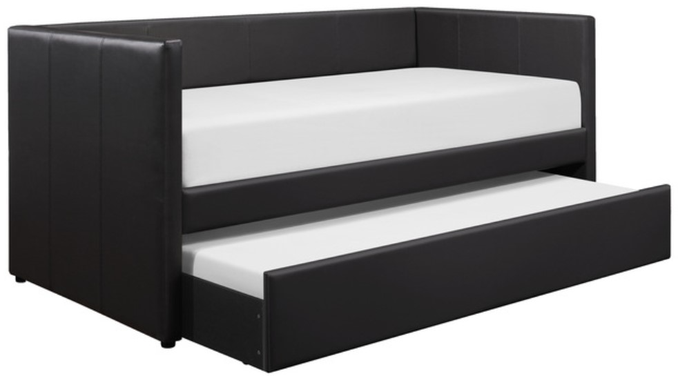 Adra collection blended with clean contemporary lines and black faux leather covering, creates a look that will compliment your home’s decor. Whether used for sleeping or relaxing, the clean-line trundle design allows for placement in a number of room sizes and configurations, while the under-bed trundle pulls out to accommodate your additional sleep space needs.Read More