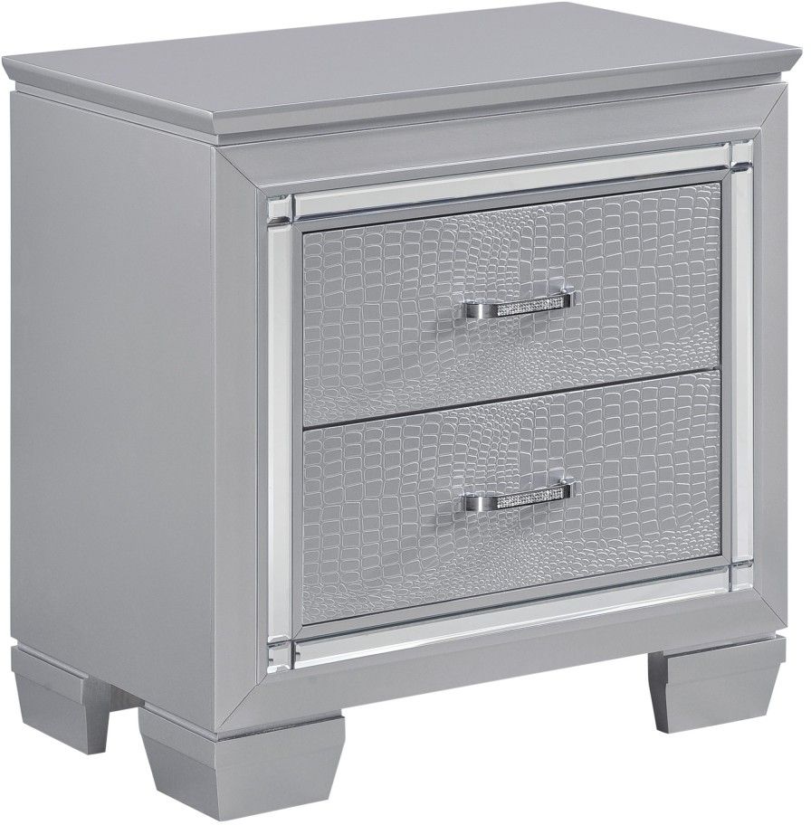 Glamour reigns in the design of the Allura collection. A framing nightstand is a decorative beveled mirror accent that enhances the illumination from the touch-engaged LED under-light of the nightstand. The alligator embossing of the drawer fronts is paired with high-polished crystal-enhanced hardware that boldly decorates the silver finish.Read More
