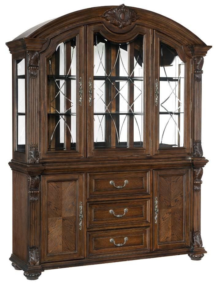 Faux keyhole hardware fronts the doors of the china, while traditional bale hardware fronts the drawers. The glass doors of the china’s hutch allow for enclosed display of your tabletop accessories and decorative items while the base of the unit features wood doors that provide a closed storage option. Traditional accenting abounds throughout the piece with classic routed pilasters, moldings, and decorative pediments gracing the design.