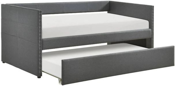 Maximize your guest room or living space with this stylish dark gray textured fabric daybed, featuring a convenient pull-out trundle bed for extra sleeping space. Crafted with a sturdy plywood and engineered wood frame, soft textured fabric upholstery, and elegant nailhead trim, this daybed offers both comfort and sophistication.Read More