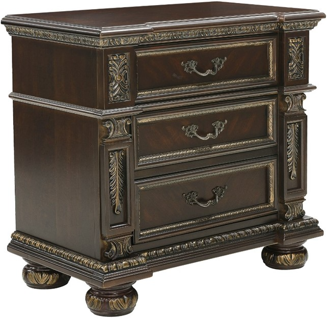 Each drawer front features dark bronze fixed-drop hardware with decorative flourish that furthers the elegant appointments that embellish this collection. A traditional cherry finish is utilized to highlight the cherry veneer of the set and decorative inlay patterns found on the nightstand top.