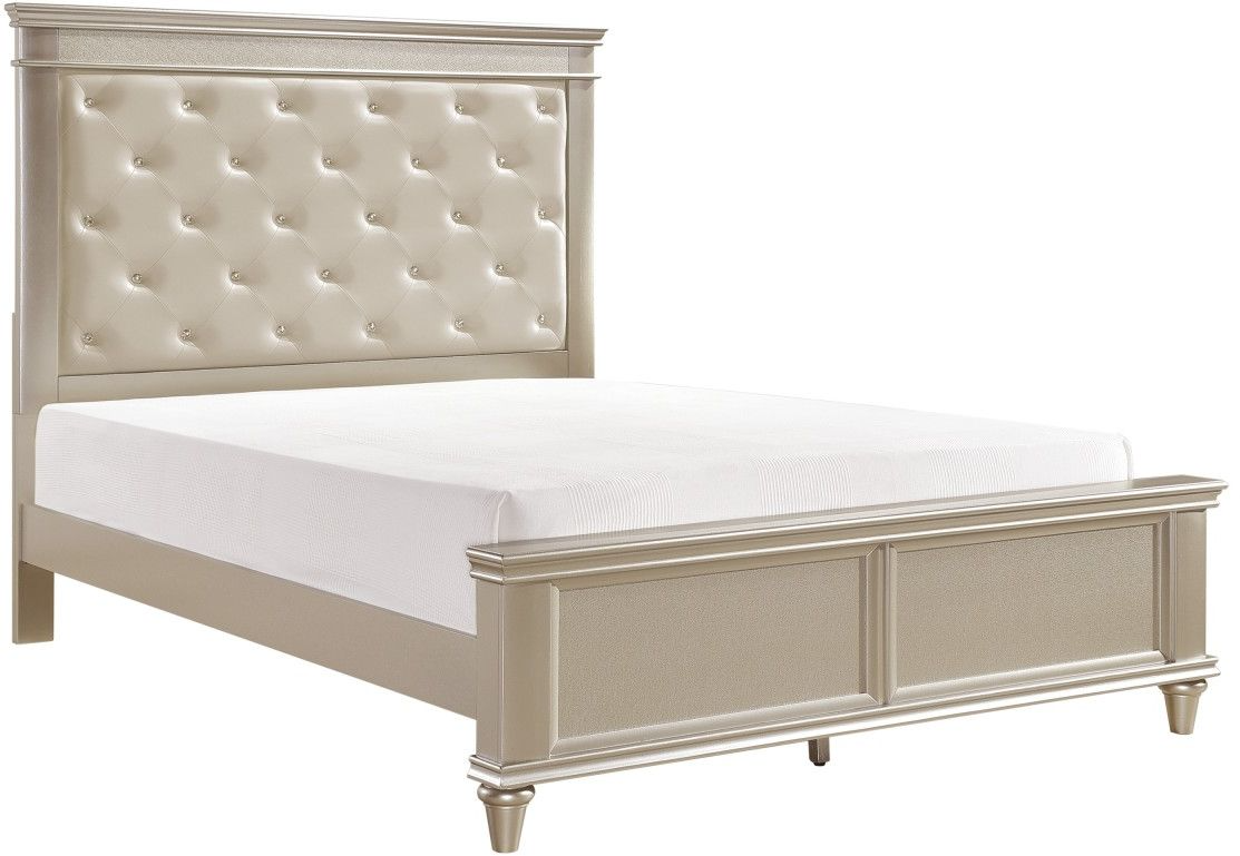 The look of traditional design is updated for the modern traditional home in the Celandine collection. Crystal tufting immediately draws the eyes to the pearlized finish of the faux leather headboard insert. With each of the aforementioned elements, subtle glamour will be achieved in the design of your elegant bedroom.Read More