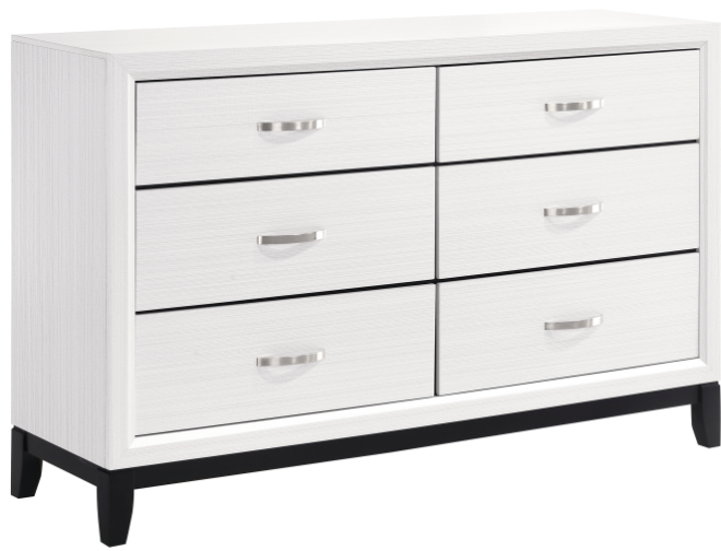 Contrasting the dresser's printed white wood grain, on melamine veneer, are nickel-finished, metal, fixed drawer pulls and black base rail.