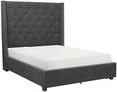 The stately profile of the Fairborn Collection will lend an air of understated elegance to your bedroom. The California King mansion headboard features nailhead accent and button tufting creating a modern traditional look that defines your personal style. Gray fabric covers the bed, providing neutral complement to your decorative bedding.Read More