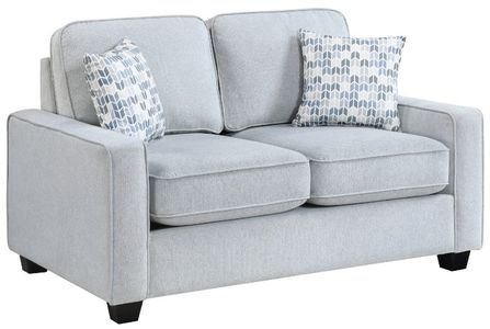 Bring versatile comfort and a touch of modern style to your home with this Light gray Fabric Loveseat. Featuring reversible back and seat cushions, this loveseat offers extended comfort and longevity, allowing you to easily refresh its appearance. Two decorative pillows add a touch of pattern and comfort.Read More