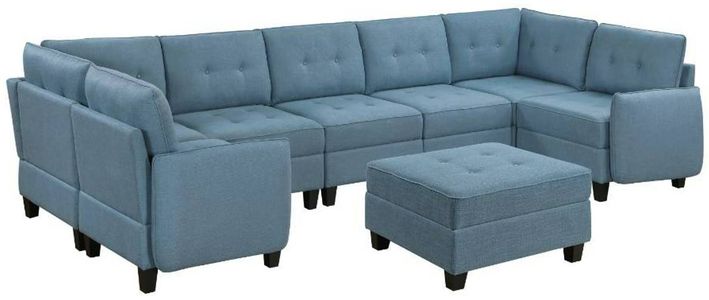 Maximize both seating and versatility with this blue textured fabric 8-piece U-shaped modular sectional, featuring a comfortable ottoman and hidden storage beneath the seats for added convenience. This expansive yet space-conscious sectional comprises two one-arm chairs, three armless chairs, two corner seats, and an ottoman.Read More