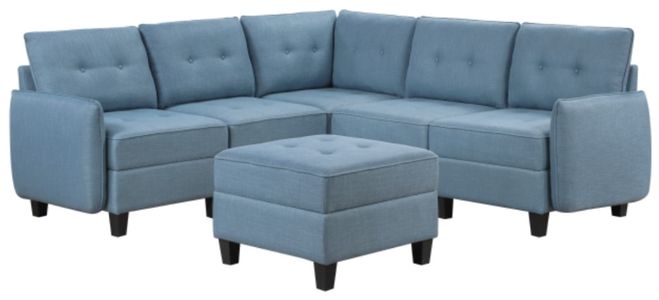 Maximize both space and comfort with this blue textured fabric 6-piece modular sectional, featuring a versatile ottoman and hidden storage beneath the seats for added convenience. This compact yet expansive sectional, comprised of two one-arm chairs, two armless chairs, a corner seat, and an ottoman, boasts a solid wood and plywood frame.Read More