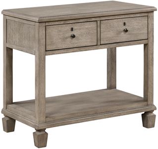 Additional decorative touch comes in the form of keyhole accenting located above each drawer knob. The open design of the nightstand’s base allows for open display and storage. The oak veneer of the collection features a gray oak finish.