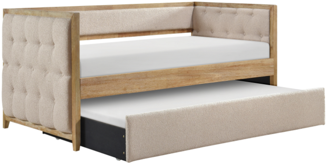 Beige boucle fabric upholstery covers the daybed and is accented with button tufting and a show-wood frame - its natural hue further complementing the bed’s neutral fabric. Whether used for sleeping or relaxing, the daybed’s design allows for placement in a number of room sizes and configurations.Read More